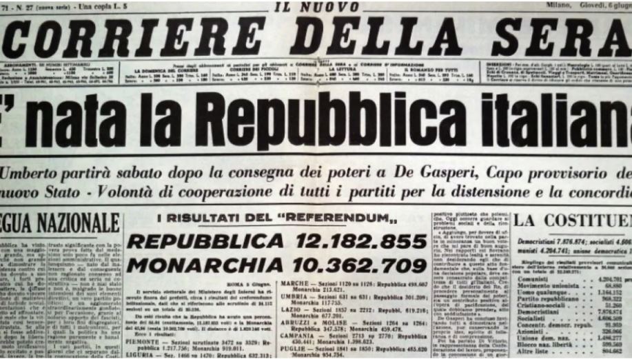 Il 10 giugno, alle ore 18, nel Salone della Lupa a Montecitorio, il Presidente Pagano legge i risultati: ‘˜Repubblica: 12.717.923 (pari al 54,28%); Monarchia: 10.719.884 (pari al 45,72%); nulli: 1.498.136’.
