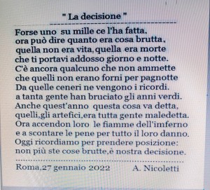 Quel momento, con la memoria ci faccia volare liberi sempre al di sopra delle nefandezze e miserie umane, con consapevolezza, leggerezza e fortezza puntando lo sguardo verso l'infinito.