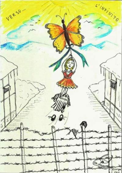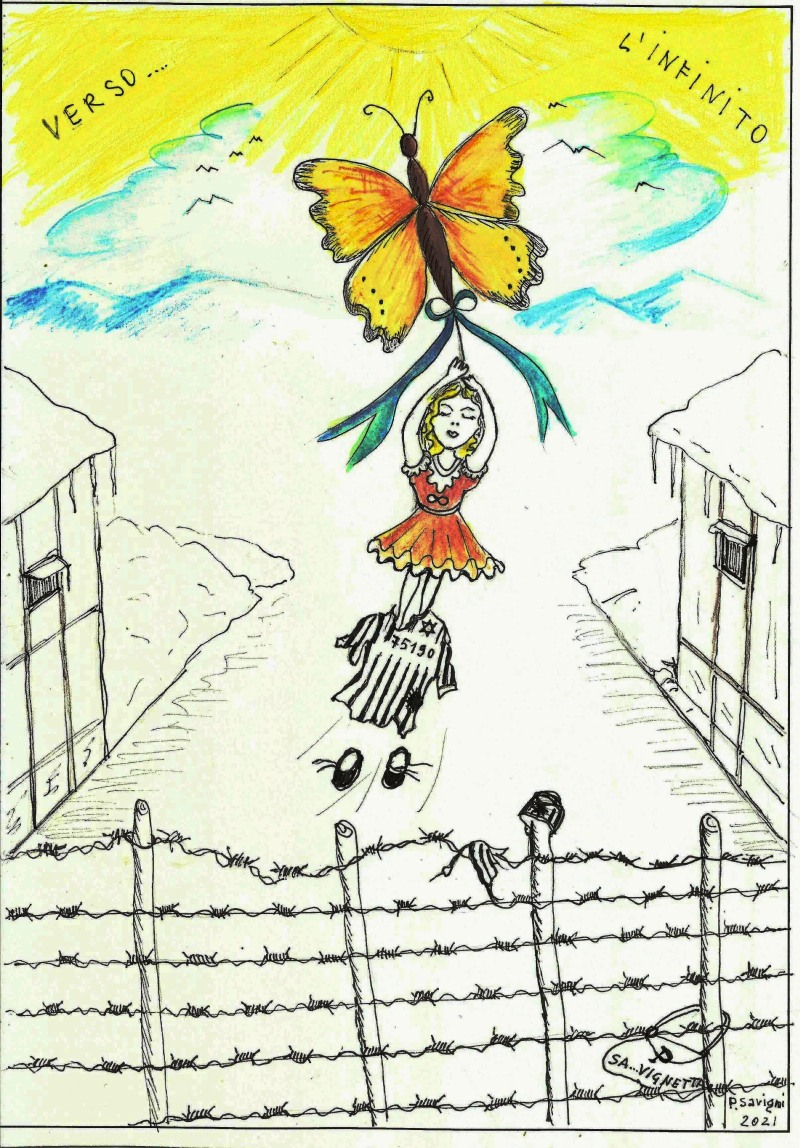 Nel Giorno della memoria il mio pensiero va alla Senatrice Liliana Segre:la vignetta è a Lei dedicata e al numeroso stuolo di anime che hanno volato alto sopra le miserie umane verso l'infinito. Il numero sulla casacca a righe è lo stesso stampigliato sul braccio della signora Liliana: non si cancella non dobbiamo cancellarlo ma ricordarlo insieme a lei col suo stesso sguardo che volse alla farfalla gialla sul filo spinato, il giorno della liberazione. Liberiamoci di tutto ciò che di peggio fa l'uomo, ma traendone un momento liberatorio positivo, volando liberi verso l'infinito.
