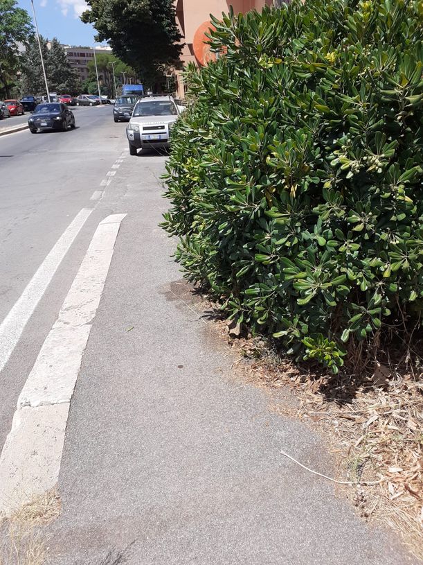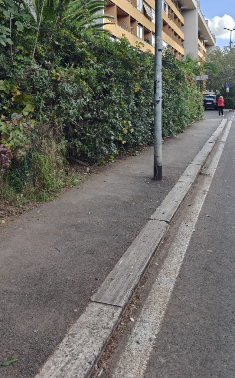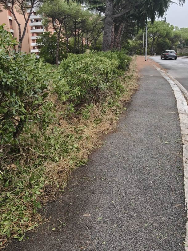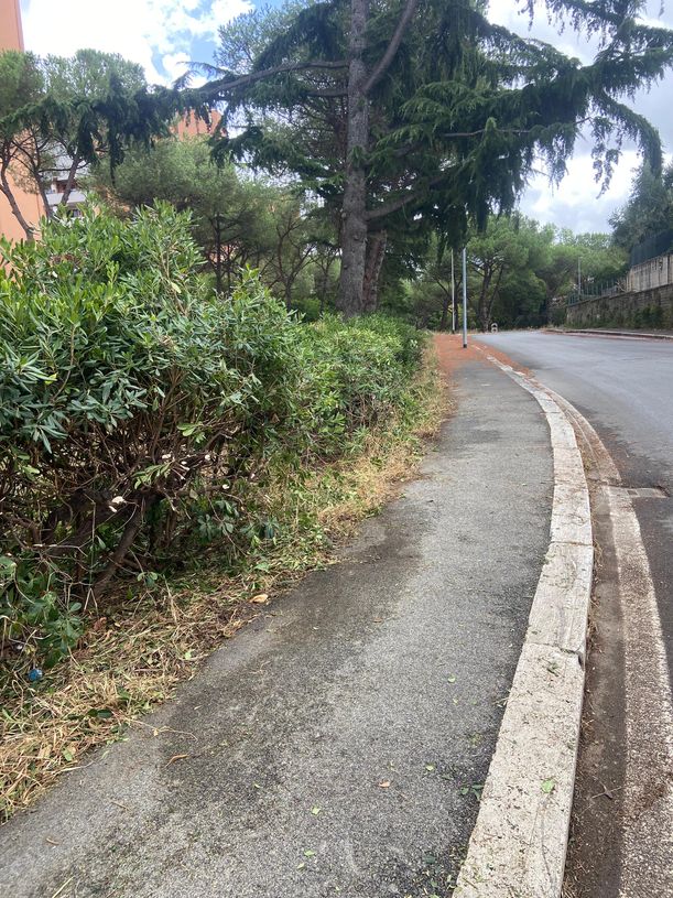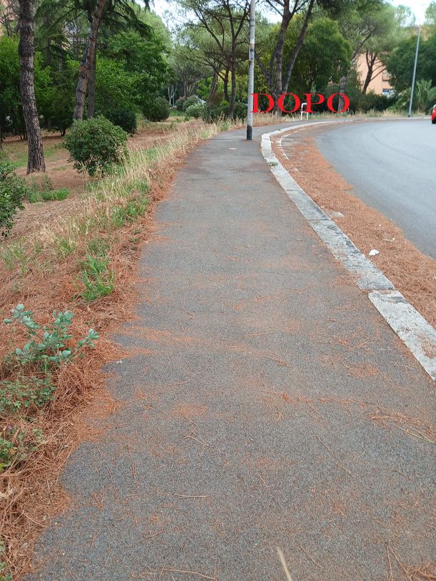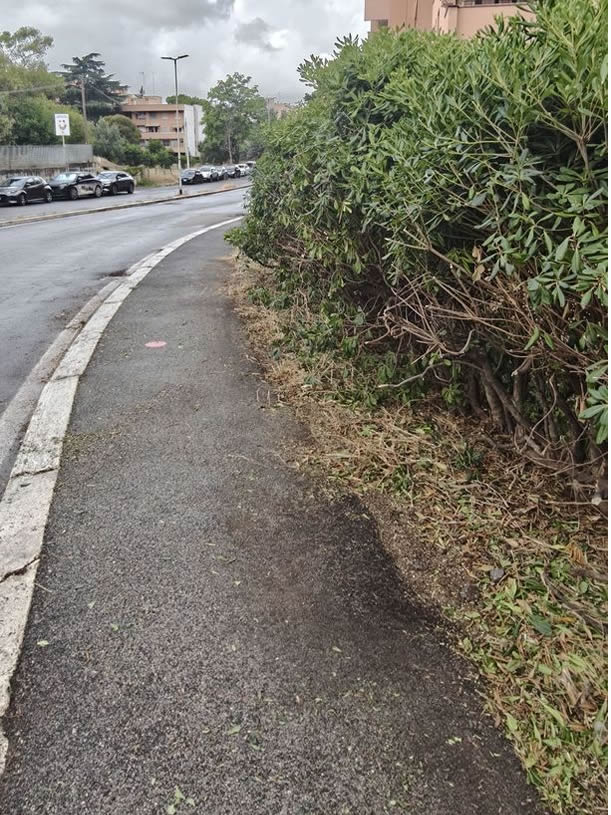 Intervento di pulizia del marciapede da aghi di pino e di potatura delle siepi in via Ascari 28 luglio 2025