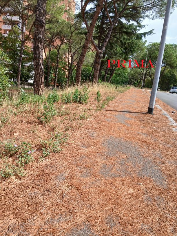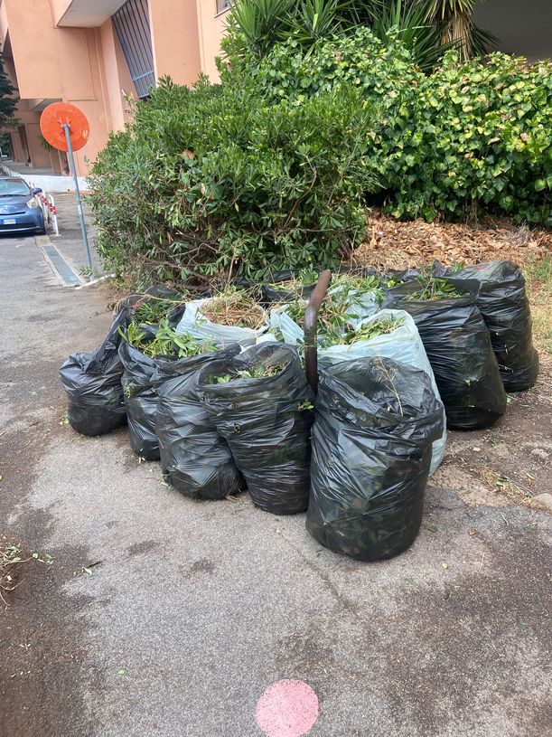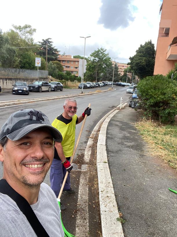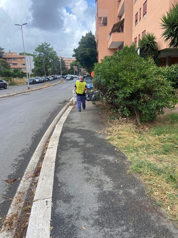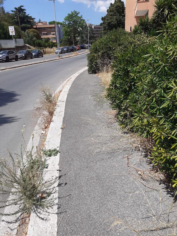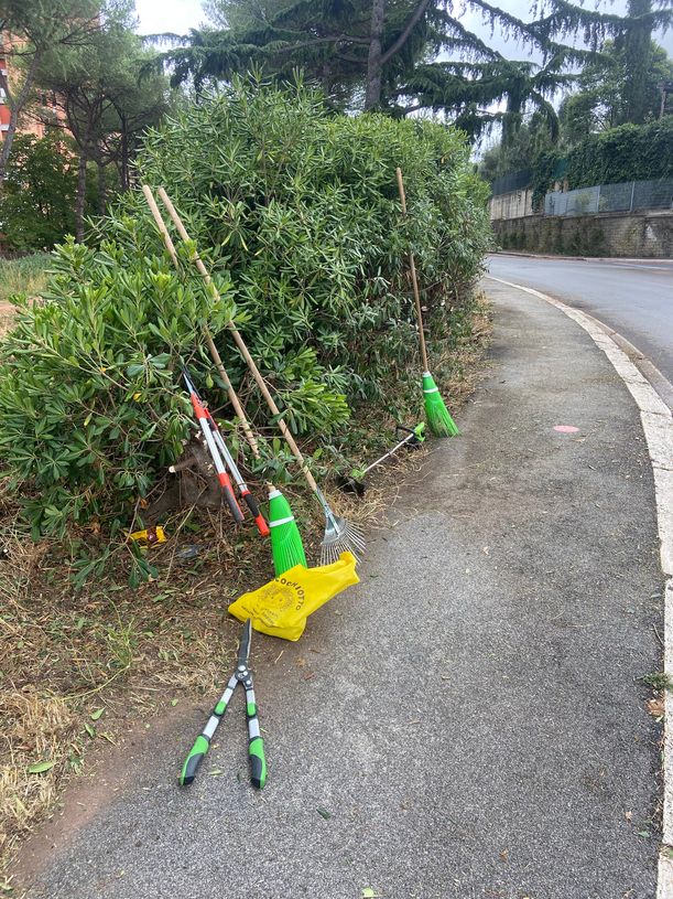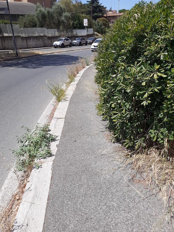 Intervento di pulizia del marciapede da aghi di pino e di potatura delle siepi in via Ascari 28 luglio 2025